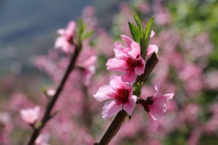 在瀘定縣冷磧鎮(zhèn)、德威鎮(zhèn)等地,桃花、油菜花及櫻花競相開放,一團(tuán)團(tuán)、一簇簇,綴滿枝頭,藍(lán)天、白云與各色花兒相交,金黃花海在微風(fēng)中起伏。一畦畦油菜花田錯落有致、層次分明,綿延不斷?!岸聶鸦ㄩ_,三月桃花盛,四月紅櫻桃,五月水蜜桃?!背擞筒嘶ǎ磕觋柎喝?,瀘定的桃花也隨著和煦春風(fēng)落滿枝頭滿樹的花芽沁著香氣,一點(diǎn)點(diǎn)溢到空氣中,香了春風(fēng),也香了整座城。