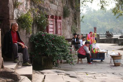 大榮橋。這座建在瀨溪河上、歷經(jīng)數(shù)百年的古石橋,一頭連著大足的地盤,一頭連著榮昌的地盤,故名??创髽s橋的最佳觀景點設在大榮寨對面的萬靈山腰,從那里看大榮橋和橋拱那端毗鄰的大榮寨,一種看白描連環(huán)畫中古鎮(zhèn)的感覺,就冉冉升起了。
