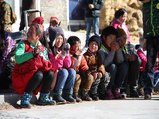 中午,高原的陽光暖洋洋的,有了空閑時間的村民們都來到活動中心,一邊曬太陽,一邊觀看孩子們的表演。