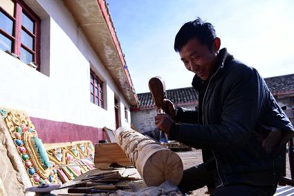 道孚民居的精華在其內部,木材是其唯一的內部裝飾材料,而裝飾,是一項繁瑣得曠日持久的藝術勞作,往往建房只需一兩個月,內部裝飾則要幾年甚至幾十年。民間建筑藝術家們沉醉在細致入微的勞作里,讓每一個圖案都盈溢一份心底的吉祥,讓每一筆描摹都傳遞一份動人的傳說。房間四壁、房門和梁柱上一般都繪滿了精致典型的藏式壁畫,窗上分別雕刻著龍、鳳、仙鶴、麒麟等吉祥圖案。每間屋的大門上都鑲嵌醒目的兩個獅頭大銅環(huán),凸顯了與之相融的漢文化的特點。置身其間,色彩斑斕中,身邊盡是龍飛鳳舞,鶴翔麟躍。繽紛中細端詳,真是藏民族藝術的天堂!