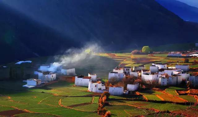 村子坐落在兩座大山之間的平原地帶,夏天和秋天是村子最美的時候,夏天村子里的青稞綠油油的一片,秋天變成一浪又一浪的金燦燦,甚是壯觀…