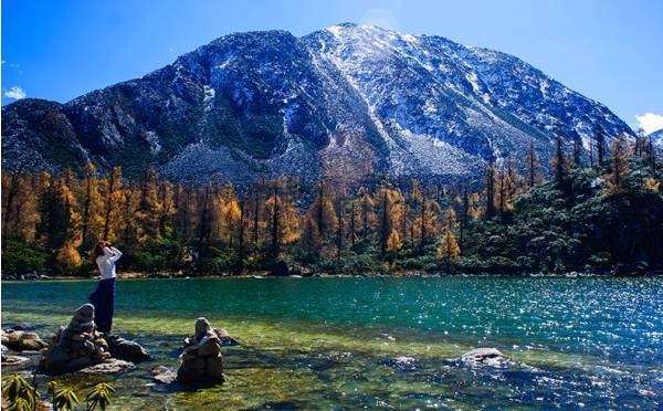 被原始森林和草甸環(huán)抱的五須海,當(dāng)?shù)厝擞鳛椤跋膳釆y的明鏡”,湖水碧綠透亮,將周圍的山水和天空全映照在湖面,幽靜的像一幅畫。從夏到秋周圍百花盛開,古樹盤根錯節(jié)、藤枝攀沿纏繞,杜鵑樹伸向湖面,仿佛進入原始古樸的仙境。