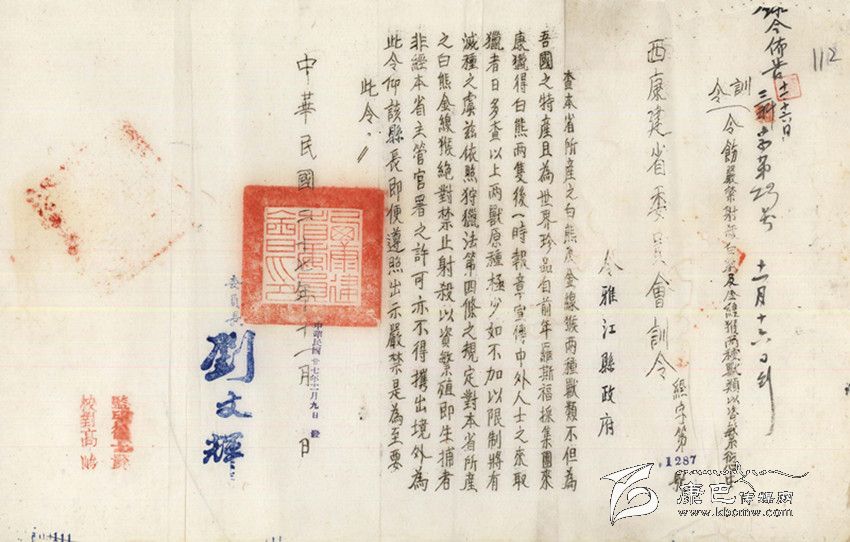 民國27年(公元1938年),“西康省建省委員會(huì)”發(fā)出“經(jīng)字第1287號(hào)”訓(xùn)令,這是一份難能可貴的保護(hù)野生動(dòng)物的訓(xùn)令,訓(xùn)令說:“查本省所產(chǎn)之白熊及金線猴兩種獸類,不但為吾國之特產(chǎn),且為世界珍品。自前年羅斯福采集團(tuán)來康獵得白熊兩只后,一時(shí)報(bào)章宣傳,中外人士之來取獵者日多。查以上兩獸原種極少,如不加以限制,將有滅種之虞。茲依照狩獵法第四條之規(guī)定,對(duì)本省所產(chǎn)之白熊、金線猴絕對(duì)禁止射殺,以資繁殖。即生捕者非經(jīng)本省主管官署之許可,不得帶出境外。為此令仰該縣長即便遵照出示嚴(yán)禁是為至要,此令。”訓(xùn)令最后署有“西康建省委員會(huì)委員長劉文輝”的簽名。