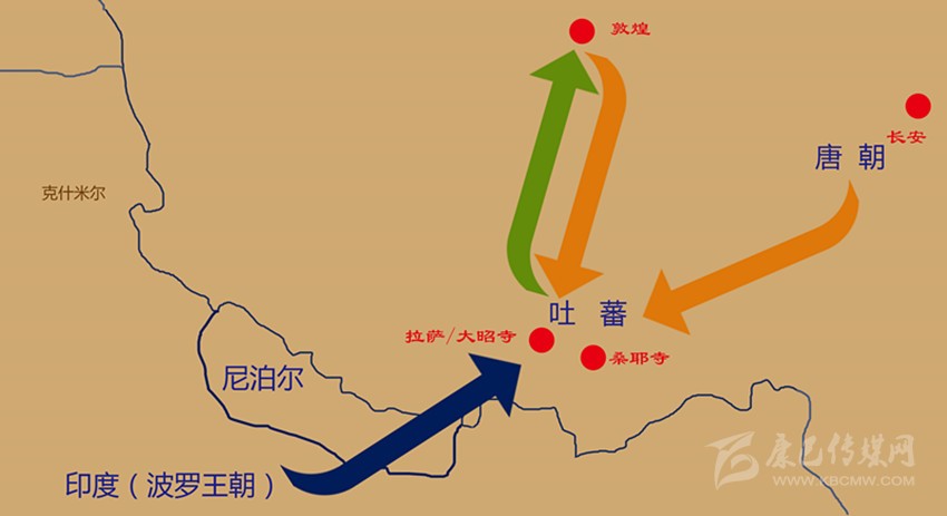 另外,在唐代敦煌繪畫《藥師佛及兩菩薩》的畫面上,藥師佛及脅侍菩薩造型和大昭寺法王殿壁畫的風(fēng)格非常一致的,都是屬于印度波羅藝術(shù)風(fēng)格。但是畫面中部的文殊菩薩、普賢菩薩則又是中原漢地繪畫風(fēng)格。在這幅畫的背后有藏文和漢文的題記,講述這幅畫是由一個(gè)叫白央的藏族畫家和幾個(gè)漢族畫家一起合作完成的。印度的風(fēng)格影響到了敦煌,同時(shí)敦煌的中原繪畫風(fēng)格又再次傳到了吐蕃。從這些情況可以看出:前弘期的繪畫風(fēng)格是深受印度波羅藝術(shù)和漢地繪畫藝術(shù)的雙重影響。