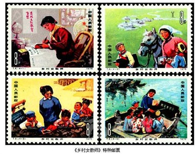 “燃燒自己,照亮別人”,是每一位教書(shū)人的精神寫(xiě)照。在我國(guó)發(fā)行的郵票中就常常出現(xiàn)那些工作在基層的普通教師的忙碌身影。1959年9月25日,我國(guó)發(fā)行《人民公社》特種郵票,其中第5枚“學(xué)”,圖案是一位手執(zhí)課本神情專(zhuān)注地在課堂上教學(xué)的老師。這是我國(guó)郵票中首次出現(xiàn)教師形象。1966年5月10日,我國(guó)發(fā)行《服務(wù)行業(yè)中的婦女》特種郵票,其中第4枚“保育員”,是反映我國(guó)幼兒教師工作情景的一枚郵票。1976年2月20日,我國(guó)發(fā)行《勝利完成第四個(gè)五年計(jì)劃》紀(jì)念郵票,其中第13枚“牧區(qū)小學(xué)”,圖案是一位藏族女教師在寬敞明亮的教室里授課的情景,反映了新中國(guó)成立后,特別是第四個(gè)五年計(jì)劃期間,我國(guó)少數(shù)民族地區(qū)飛速發(fā)展的教育事業(yè)。1975年3月8日,我國(guó)發(fā)行《鄉(xiāng)村女教師》特種郵票,全套4枚,圖案分別是“認(rèn)真看書(shū)學(xué)習(xí)”“巡回教學(xué)”“開(kāi)門(mén)辦學(xué)”和“水上小學(xué)”。全套郵票是工作在廣大農(nóng)村的中小學(xué)教育工作者在辦學(xué)條件艱苦的情況下仍然堅(jiān)持認(rèn)真學(xué)習(xí)、勤奮工作、忠于黨的教育事業(yè)的真實(shí)寫(xiě)照。