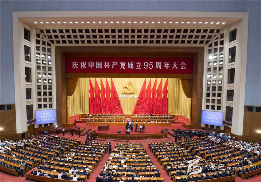 人民大會(huì)堂雄偉莊嚴(yán),萬(wàn)人大禮堂燈火輝煌。主席臺(tái)上方懸掛著“慶祝中國(guó)共產(chǎn)黨成立95周年大會(huì)”會(huì)標(biāo)。帷幕正中,由鐮刀和錘頭組成的中國(guó)共產(chǎn)黨黨徽在十面紅旗映襯下熠熠生輝,“1921-2016”字樣格外醒目。大禮堂二層眺臺(tái)懸掛橫幅:緊密團(tuán)結(jié)在以習(xí)近平同志為總書(shū)記的黨中央周圍,銳意進(jìn)取、開(kāi)拓創(chuàng)新,全面推進(jìn)黨的建設(shè)新的偉大工程,為實(shí)現(xiàn)“兩個(gè)一百年”奮斗目標(biāo)、實(shí)現(xiàn)中華民族偉大復(fù)興的中國(guó)夢(mèng)而努力奮斗!