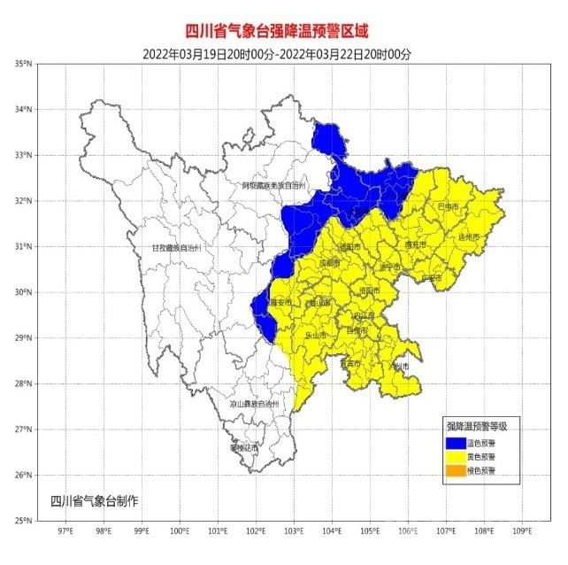 3月18日下午以來,四川省成都、南充、廣元、眉山、內(nèi)江、綿陽、雅安、遂寧、樂山、瀘州、資陽、眉山、宜賓13市都發(fā)布了強(qiáng)降溫黃色預(yù)警,德陽、巴中2市發(fā)布了強(qiáng)降溫藍(lán)色預(yù)警,廣安、內(nèi)江2市于3月19日升級(jí)發(fā)布了強(qiáng)降溫黃色預(yù)警。