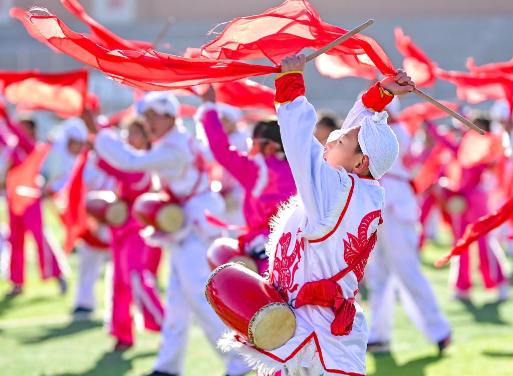 ??2023年11月16日,內蒙古鄂爾多斯市鄂托克前旗第二小學的學生在大課間表演安塞腰鼓。該校將安塞腰鼓列入學校的校本課程和大課間活動,聘請民間藝人傳授技藝,讓非遺文化在校園中傳承。新華社發(fā)(王正攝)