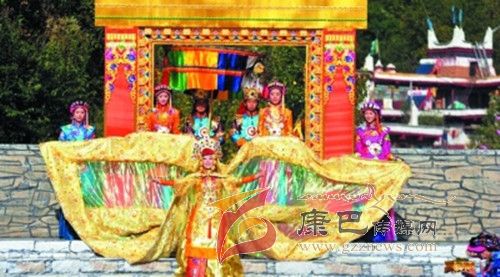 在催人奮進(jìn)的戰(zhàn)鼓聲中,一群身披甲胄的士兵拿著長(zhǎng)劍,背著巨弓走到臺(tái)前,在鏗鏘的戰(zhàn)鼓聲中,戰(zhàn)士們做著各種競(jìng)技動(dòng)作,模仿武士們互相攻擊的樣子,那矯健的身影展示了遠(yuǎn)古時(shí)代嘉絨藏族先民們?yōu)榱松媾c自然努力抗?fàn)幍膱?chǎng)景。過(guò)了一會(huì)兒音樂(lè)一轉(zhuǎn),戰(zhàn)鼓聲漸漸減弱,在鳥雀的陣陣啾啾聲中,一座木門慢慢的開啟,一位身披長(zhǎng)袍、頭戴鳳冠的女王在眾多美女的簇?fù)硐?,緩緩走下臺(tái)階步入舞臺(tái)中央,此時(shí),一位手捧托盤的老者來(lái)到女王面前單膝下跪,將托盤高舉過(guò)頂,并邀請(qǐng)女王品嘗佳肴,女王將中指在酒中蘸了蘸,并曲起中指向四周輕輕彈去,寓意愿將杯中美酒與四方百姓同飲。在女王面前還放置著一個(gè)凈水桶,桶中盛滿了清澈的甘泉,桶上橫放著一枝柏樹枝,女王伸出纖纖玉手,拿著柏樹枝在水中蘸了蘸,面向墨爾多神山撒去,寓意向神山祈福。這是此次《美人谷·丹巴》節(jié)目展演中的序曲部分,有著強(qiáng)烈的東女神韻,將遠(yuǎn)古時(shí)代東女國(guó)女王遺風(fēng)展演的淋漓盡致。