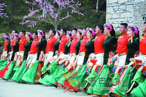 10月26日,在甲居藏寨,處處洋溢著豐收和歡樂(lè)的氣氛,人們扶老攜幼,身著節(jié)日的盛裝走到一起,來(lái)共同慶祝丹巴嘉絨風(fēng)情節(jié)的順利召開。在一塊空地中,搭建了臨時(shí)的舞臺(tái),看臺(tái)上,幾座古碉模型傲然挺立,在不遠(yuǎn)處,一座古碉矗立在一座小山包上,與古碉模型遙相呼應(yīng)、相映成趣。上午9時(shí)40分,當(dāng)節(jié)目主持人宣布嘉絨風(fēng)情節(jié)正式開始時(shí),一束束搖曳的煙花向空中飛去,在空中炸響后,散發(fā)出五顏六色的煙霧,其中有的還幻化成幾多小小的降落傘,就像多多盛開的鮮花在空中綻放。演出現(xiàn)場(chǎng)前的大地和遠(yuǎn)處的小山坡上到處都站滿了熱情的觀眾,合著禮花的爆裂時(shí)的響聲,將手中的小紅旗展開,高舉過(guò)頭頂,有節(jié)奏的左右搖動(dòng),霎時(shí)間,整個(gè)現(xiàn)場(chǎng)成為了紅色的海洋。