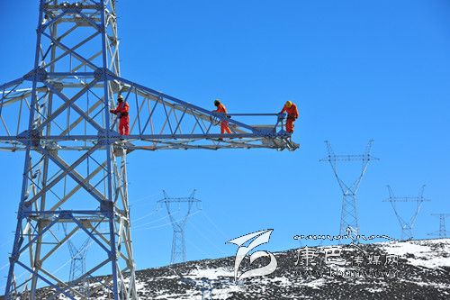 電力天路川藏聯(lián)網(wǎng)工程特別報道 11月中旬,寒風凜冽,滴水成冰。為確保我州“電力天路”無電地區(qū)和農(nóng)網(wǎng)改造建設(shè)工程明年3月份按時完工 ,四川電力公司的各路建設(shè)者,依舊保持 著旺盛的工作斗志,吃住在各施工現(xiàn)場,奮戰(zhàn)在高寒缺氧地域。圖為11月12日,電力員工奮戰(zhàn)在雅江縣境內(nèi)海拔 4412米的施工地段,登塔作業(yè)。 (楊林 攝影報道)